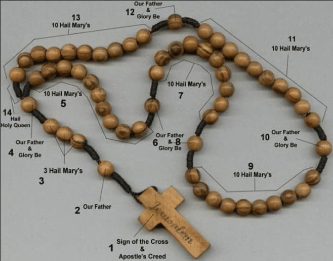 8. On the next large bead, recite the Glory Be to the Father, the Fatima prayer.
